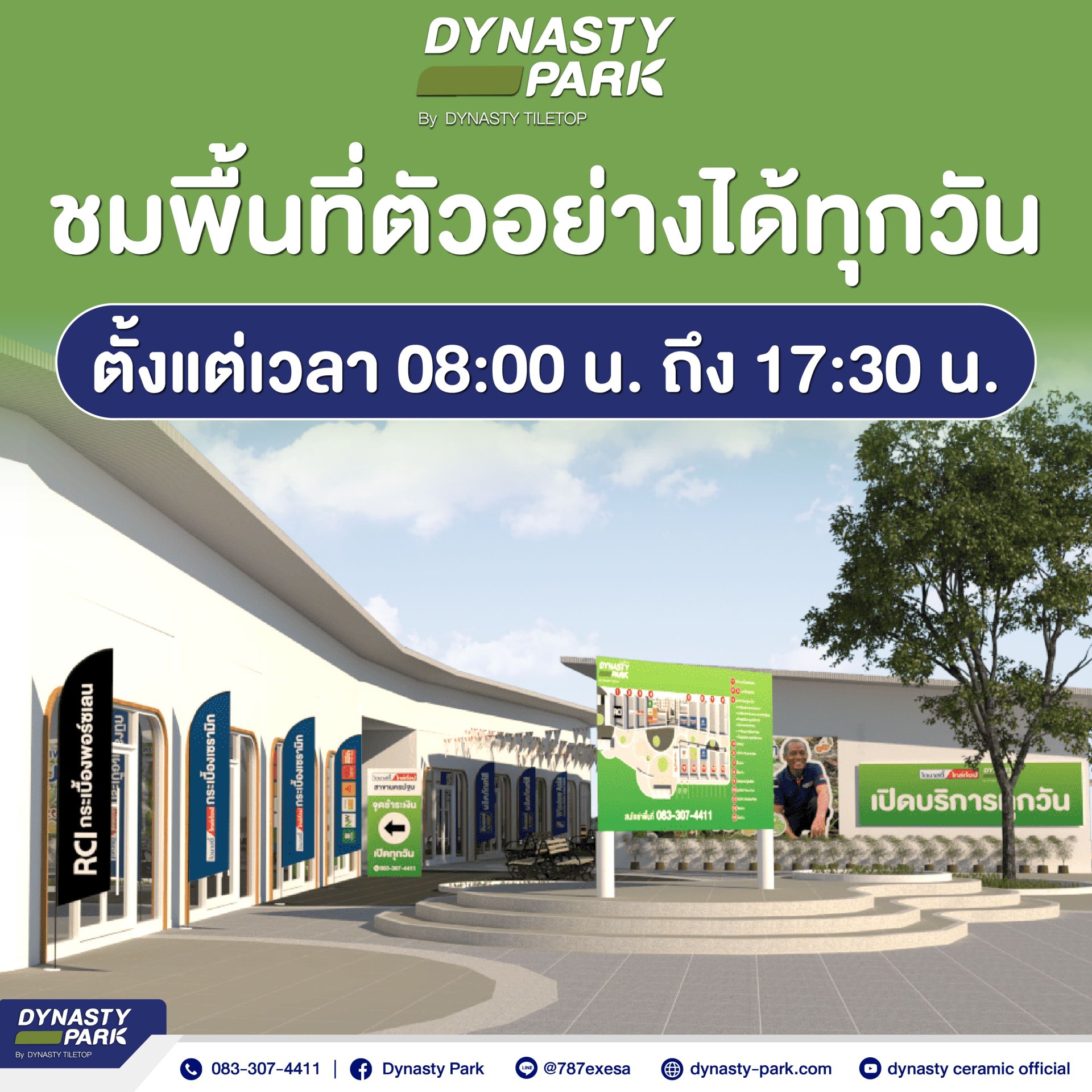 เยี่ยมชมพื้นที่ตัวอย่างได้ทุกวัน!Dynasty Park เปิดให้เข้าชมพื้นที่ตัวอย่างสำหรับธุรกิจวัสดุก่อสร้างและตกแต่งบ้านเปิดทุกวัน 08:00 - 17:30 น. มาดูทำเลจริง สัมผัสบรรยากาศ และเลือกพื้นที่ที่เหมาะกับธุรกิจของคุณ!